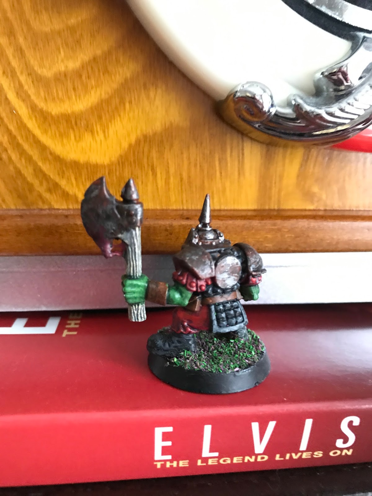 As you can see this guy suffered from enthusiastic hacking back in the day as he has lost two horns from his helmet and some very old polystyrene cement gel glue on his axe. Instead of trying to fix this I instead painted him up anyway. Call it battle damage and made the overload of glue some gore clogged on his axe.